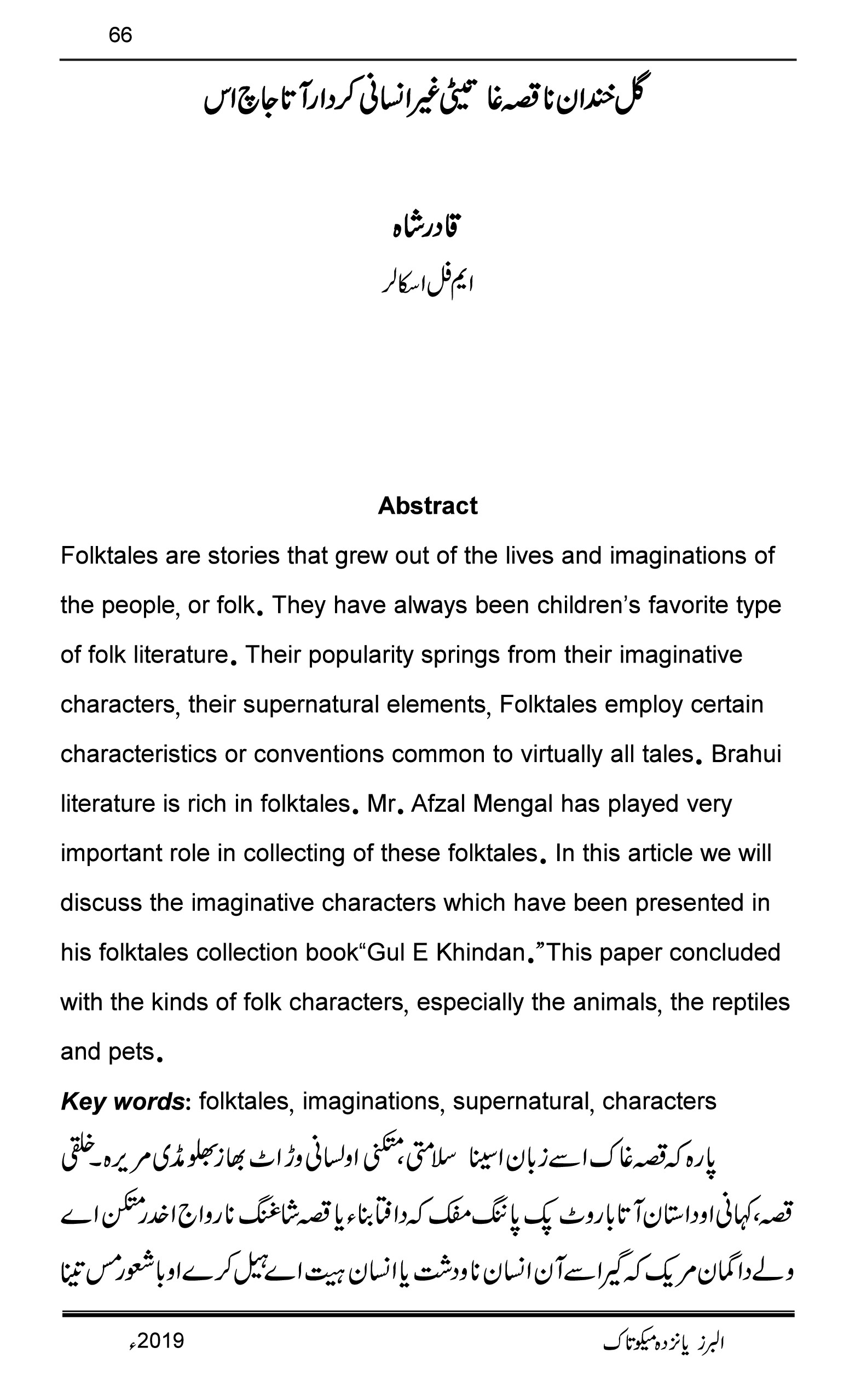 Folktales are stories that grew out of the lives and imaginations of the people, or folk. They have always been children’s favorite type of folk literature. Their popularity springs from their imaginative characters, their supernatural elements, Folktales employ certain characteristics or conventions common to virtually all tales. Brahui literature is rich in folktales. Mr. Afzal Mengal has played very important role in collecting of these folktales. In this article we will discuss the imaginative characters which have been presented in his folktales collection book “Gul E Khindan”. This paper concluded with the kinds of folk characters, especially the animals, the reptiles and pets.