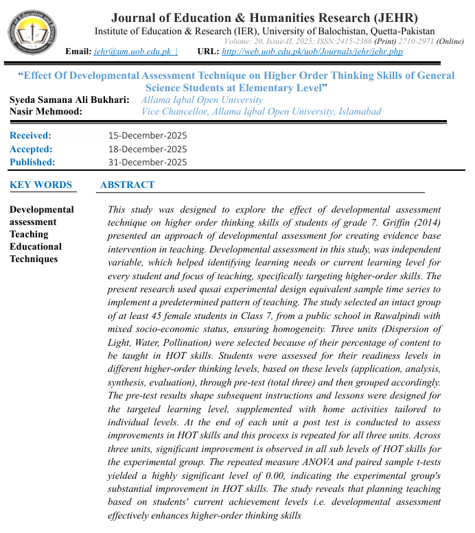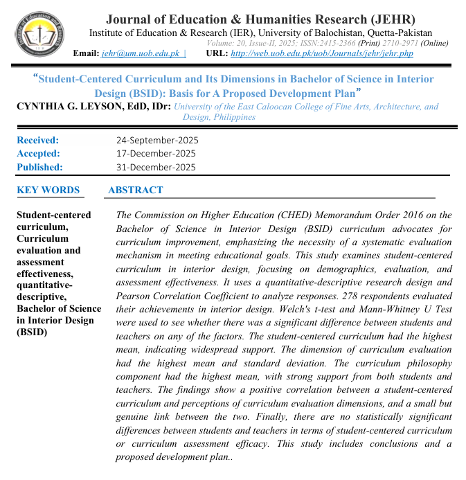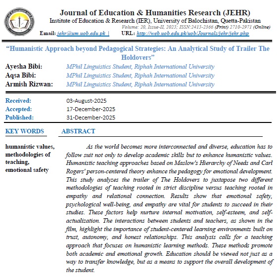 Journal of Education & Humanities Research (JEHR) is the official Journal of Institute of Education and Research University of Balochistan Quetta. JEHR is an academic journal which gains a fame in Pakistan, Asia and opens to the entire world. JEHR is a biannual and was published its first issue in 2016. The primary aim of journal is to motivate, encourage and ultimately coordinate research in all areas of education and social sciences.